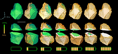 Using a working lithium-ion battery, Wang and her team tracked the phase evolution of the lithium iron phosphate within the electrode as the battery charged. They combined tomography with X-ray Absorption Near Edge Structure (XANES) spectroscopy, which is sensitive to chemical and local electronic changes. The result was a “five-dimensional” image of the battery operating: a full three-dimensional image over time and at different X-ray energies.
