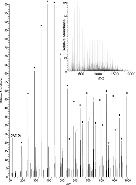 Figure 4. Negative-ion PADI spectrum of PTFE recorded on a Thermo Orbitrap mass spectrometer (unpublished data). Plasma power: 10 W. Main image displays 100–1000 m/z, insert displays full measurement range of 100–2000 m/z. Full intensity scale corresponds to 3.55 × 103 counts. Some diagnostic repeat patterns denoted by symbols: * C2O3(CF2)nF; † HNC2O6(CF2)nF; ‡ C2O4(CF2)nH.