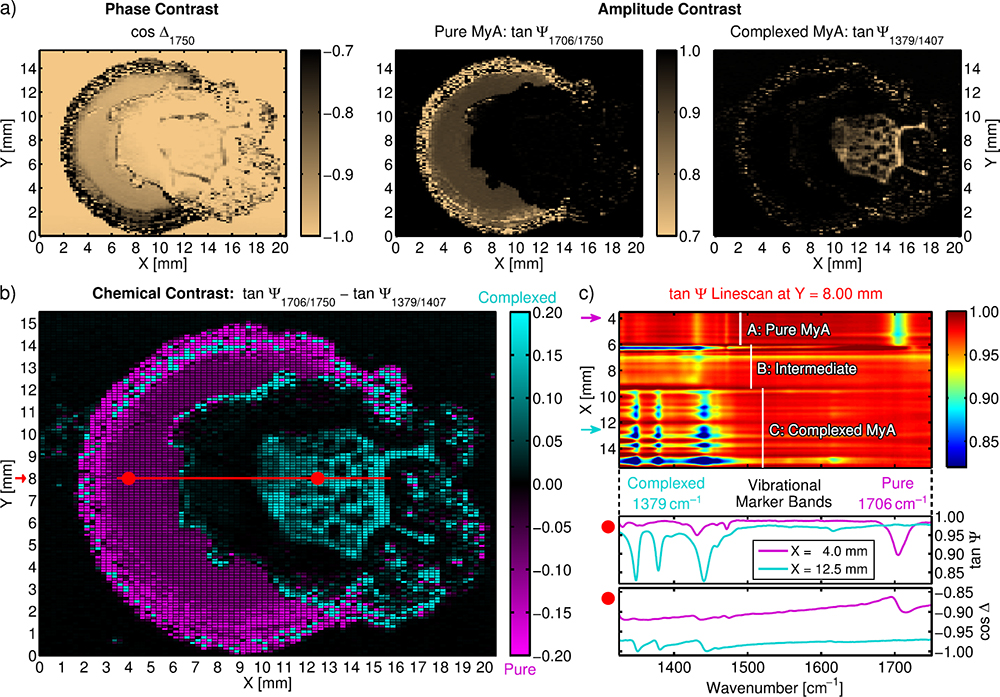 Figure 1. Hyperspectral IR ellipsometry images of a partially chemically modified, drop-cast MyA film. a) Phase and amplitude contrast at different wavelengths. b) Chemical contrast between pure and complexed MyA. c) tan Ψ linescan across the heterogeneous sample surface and exemplary ellipsometric spectra. Reprinted with permission from Reference 8 (©2019, Optical Society of America).