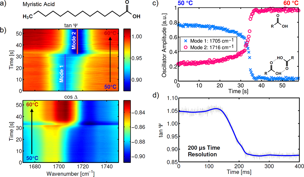 Figure 2. Time-resolved IR laser ellipsometry of the solid-to-liquid phase transition of a fatty-acid thin film upon heating/cooling. a) Chemical structure of MyA. b) ν(C=O) band amplitude and phase during slow heating. c) Oscillator amplitudes of mode 1 and 2 fitted from the spectral images. Reprinted with permission from Reference 13 (©2019, Optical Society of America). d) Sub-ms single-wavelength monitoring of mode 1 during rapid cooling.