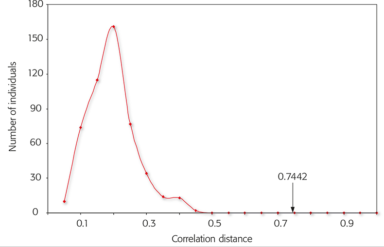 Figure 6. Correlation distance distribution of big and small cats among each other. More than 500 comparisons were performed within the Felidae family. Inter-feline distances were always smaller than 0.5. The arrow shows the distance of the spectral data of rabbit fur compared to the feline data.