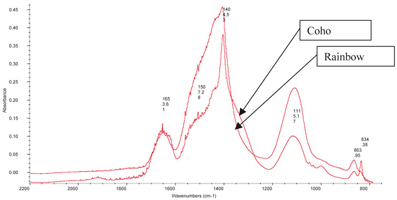 There is a lot of interest in studying fish mucus for the purpose of environmental monitoring, but the use of FT-IR spectroscopy has yet to be fully realised from such studies. However, studies undertaken by us have shown that it has potential, see, for example, Figure 2, in which FT-IR spectra of the surface mucus of two salmonid species (Coho Salmon and Rainbow Trout) show two distinct species spectral profiles. Measures such as this might be used for non-expert identification of fish species in criminal cases where the mucus could be used to differentiate legal and illegally caught fish.