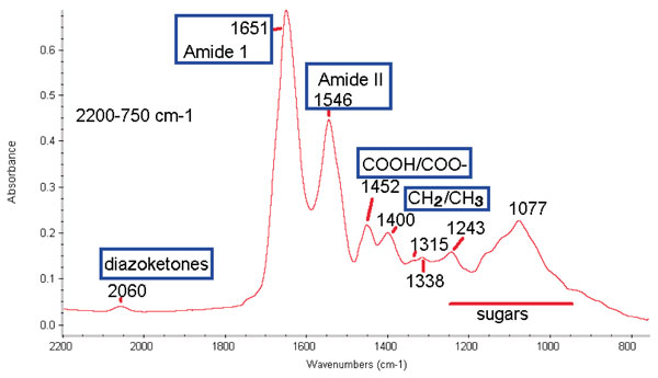 Figure 3. FT-IR spectral profile (2200–750 cm–1) of human saliva showing the influence of proteoglycans (Amide I, Amide II, COOH/COO–), lipids (CH2/CH3), and possible products of bacterial metabolism (diazoketones) on the spectral profile.