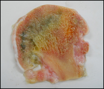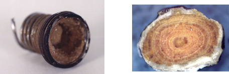 Figure 1. (A): The prostatic stent with the encrustation and the urinary stone in the lumen, (B): The cross-section of the urinary stone. The thick nucleus and the surrounding layer are discernible.