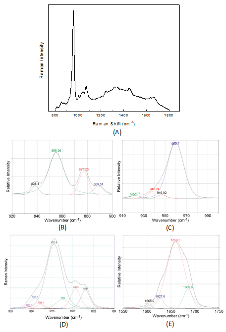 Figure 2. Raman spectrum of bone (A) and deconvolution of peaks under (B) collagen proline and hydroxyproline, (C) bioapatite, (D) carbonate, (E) amide I spectral regions.