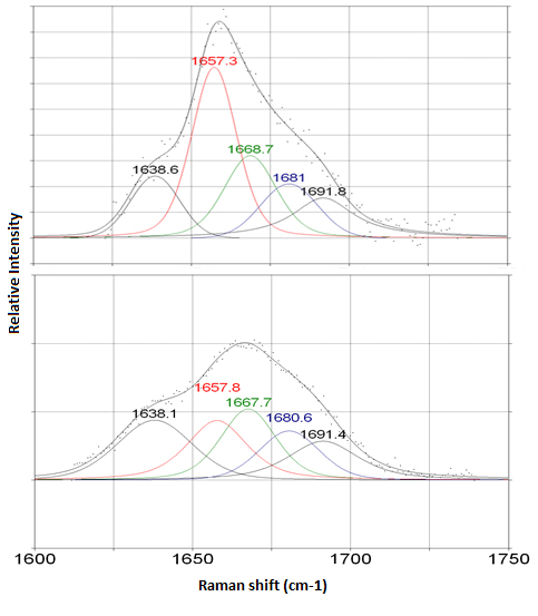 Figure 4. Coexistence of collagen type I (1657 cm–1) and collagen type II (1668 cm–1) sub-bands under the amide I band envelope of an osteoarthritic area; Raman spectrum recorded on the human femoral head section.