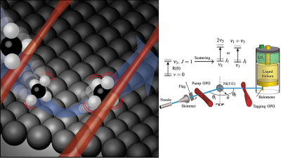 The lab of Rainer Beck at EPFL, Switzerland, has now used novel infrared laser techniques to study methane scattering on a nickel surface for the first time with full quantum-state resolution. Quantum-state resolved techniques have contributed much to our understanding of surface-scattering dynamics, but the innovation here was that the EPFL team was able to extend such studies to methane by combining infrared lasers with a cryogenic bolometer: a highly sensitive heat detector cooled to 1.8 K that can pick up the kinetic and internal energy of the incoming methane molecules.