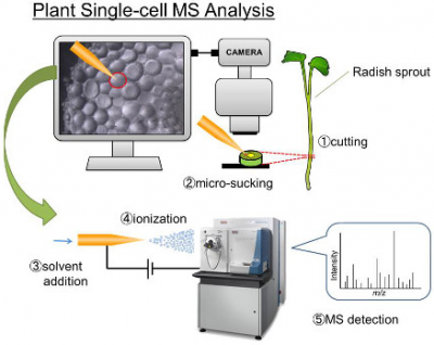 Understanding exactly what is taking place inside a single cell is no easy task. For DNA, amplification techniques are available to make the task possible, but for other substances such as proteins and small molecules, scientists generally have to rely on statistics generated from many different cells measured together. Unfortunately, this means they cannot look at what is happening in each individual cell. Now, thanks to seven years of work done at the RIKEN Quantitative Biology Center and Hiroshima University, scientists can take a peek into a single plant cell and—within minutes—get a view of the small molecules, including metabolites, hormones, nutrients, and lipids, inside it.