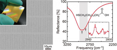 In contrast, the absorption dips were very well-pronounced in the spectral read-out for the metamaterial-monolayer, because the vibrational modes of the 16-MHDA molecules resonated with the plasmonic modes of the metamaterial. This so-called “resonant coupling” produced distinct peaks corresponding to IR-induced carbon–hydrogen stretching in the 16-MHDA molecular structure. The resonant coupling was dependent on the angle of the incident light, with the clearest, strongest signal at an angle of 40°.