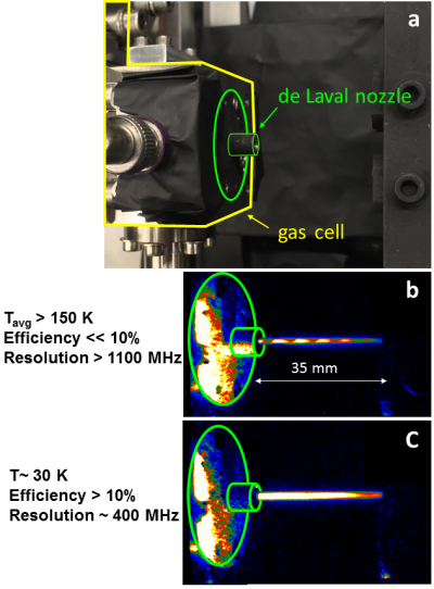 Actinium, with 89 protons, is the first and eponymous element of the actinide group. It has only one long-lived isotope (227Ac with a lifetime of 21.8 years) limiting our knowledge of the atomic transitions in this element, and thus making laser spectroscopy experiments very difficult. At the cyclotron in Louvain-la-Neuve, actinium atoms were produced in a nuclear-fusion reaction by bombarding a thin gold foil with neon nuclei. The actinium atoms were then stopped in the surrounding argon gas and transported in the cold supersonic jet of a “de Laval” nozzle, a miniaturised version resembling the exhaust of rocket engines, towards a laser interaction zone. In such conditions, resonance laser ionisation is used to ionise the atoms and perform spectroscopy studies. Pure ion beams of actinium are finally separated according to their mass to gain isotopic selection and are electrostatically guided to a detector array. “With this new technique, which is generally applicable, the spectral resolution is improved by more than an order of magnitude without loss of efficiency, and detailed experiments now become possible on nuclei produced at a rate of only one atom every ten seconds”, says KU Leuven scientist Dr Rafael Ferrer, who led the experiment.