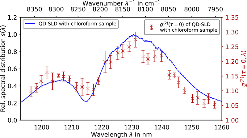 In close analogy to these spatial correlations a group at Technische Universität Darmstadt succeeded in transferring this concept into the spectral domain. In a recently published Letter in Physical Review Applied [P. Janassek, S. Blumenstein and W. Elsäßer, “Ghost spectroscopy with classical thermal light emitted by a superluminescent diode”, Phys. Rev. Applied 9, 021001 (2018)] the researchers exploited spectral correlations of broad-band amplified spontaneous emission light emitted by optoelectronic quantum dot superluminescent diodes. With this spectrally photon bunched light, the first ghost spectroscopy (GS) experiment with classical thermal photons was performed. In a real-world ghost spectroscopy experiment on chloroform at 1214 nm the researchers could prove the concept of classical GS. One of two wavelength-correlated beams was shone through a chloroform (CHCl3) sample cell in the object arm, thus measuring the transmitted full, i.e. non-spectrally resolved, intensity. The intensity correlations were determined with a second wavelength-correlated beam, the so-called reference beam in which wavelength resolution was achieved by spectrally tunable filters. The researchers succeeded in reconstructing a ghost spectrum in terms of the second order correlation function g(2)(λ) which clearly exhibited the chloroform absorption signatures at 1214 nm.