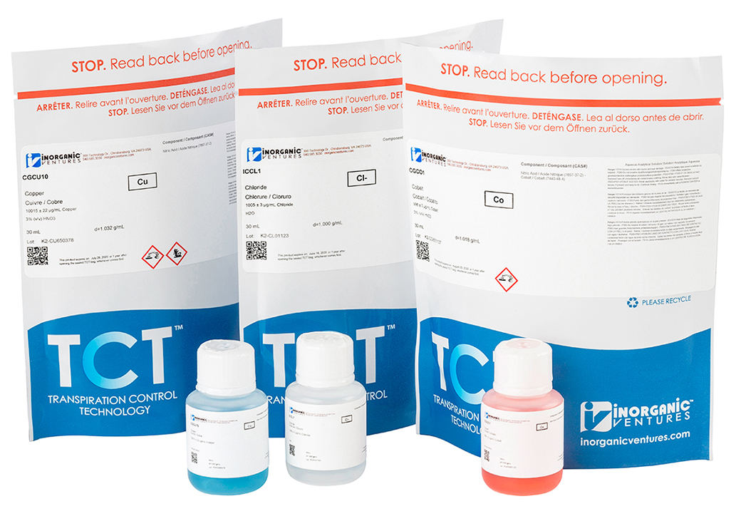 Inorganic Ventures now offers custom ICP and IC calibration standards in smaller, 30 mL volumes. They have up to a three-year shelf life in sealed transpiration control technology bag. The smaller volumes offer total cost savings, ship as non-hazardous, produce less lab waste, enable simplified inventory management and increase confidence by reducing the likelihood of contamination.