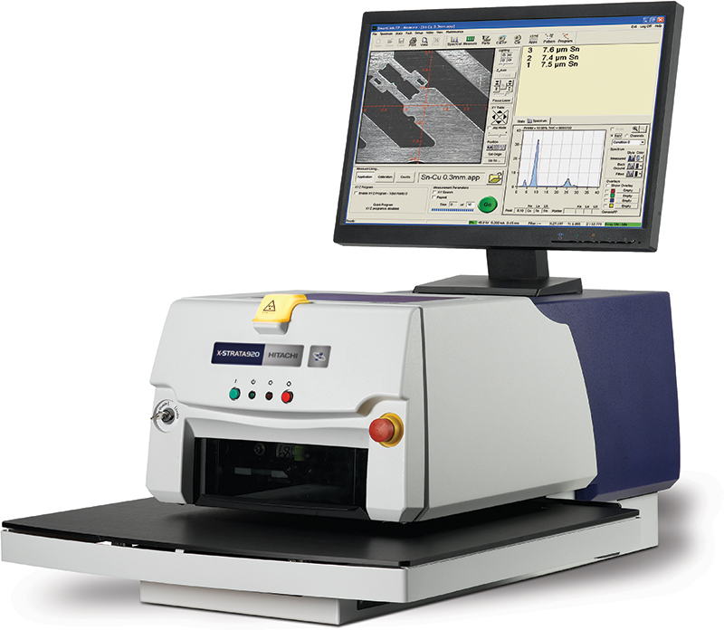 Hitachi High-Tech Analytical Science Corporation has expanded the capabilities of the X-Strata920 XRF coatings analyser to include a new high-resolution SDD detector and a new sample stage configuration. The X-Strata920 can help ensure that coatings meet the required specifications and minimise waste from excess coating or scrapping under-plated material. As well as the SDD option, the new X-Strata also has four chamber and base configurations to handle a large selection of sample shapes and sizes, including complex geometries found in the automotive industry. An SDD can offer advantages over a proportional counter for complex coating structures, as it can more easily analyse elements that have similar XRF characteristics, such as nickel and copper. This extends the range of elements that can be analysed to include phosphorus—important for electroless nickel analysis, and can more precisely measure thin coatings, such as gold in the nanometre range when conforming to IPC-4552A.
