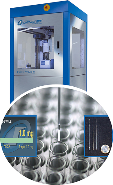 Chemspeed Technologies have introduced a sample preparation solution for NMR spectroscopy and LC/MS. This makes use of Chemspeed’s SWILE technology that provides automated one-to-one gravimetric “pick & decision dispense”. Dispensing mass ranges from <100 µg to 100 mg with ±10 µg resolution. Disposable glass tips ensure there is no cross-contamination; they are available in different diameters depending on the amount to be dispensed. The NMR and LC/MS sample preparation solution provides automated sample dispensing into NMR tubes or LC vials.