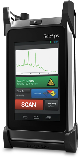 The Chem 200 from SciApps has been developed for military, law enforcement and first responder users. It is Android-based and has on-board HazMasterG3 decision support software. It includes a macro camera for photo documentation of samples tested and reading of 2D barcodes. It is completely touchscreen driven, useable with or without gloves. It features continuous and preset adjustable laser focus, which helps prevent the situation where the laser is focussed on the sample holder rather than the sample itself. The vial holder accommodates both 15 mL and 8 mL vials, and there is a right-angle adapter for bagged materials and the “adjustable pointer” for testing through thick plastic bags or plastic or glass bottles.