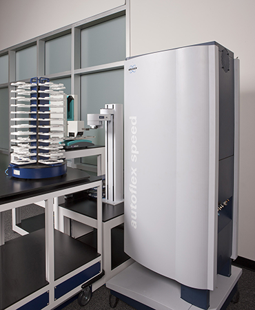 The MALDI PharmaPulse is a high-throughput screening (HTS) solution to help pharmaceutical companies achieve high throughput, lower cost and higher specificity in drug discovery. It is based on the autoflex speed MALDI-TOF system and incorporates an integrated automation solution from HighRes Biosolutions. Its capabilities include: <1 s per sample analysis time; seamless preparation and feeding of MALDI plates from 96, 384 and 1536 assay plates; MALDI detection removes the need for SPE cartridges or LC columns, uses 100× less solvent per sample than conventional LC-MS; capable of screening over 50,000 compounds per day.