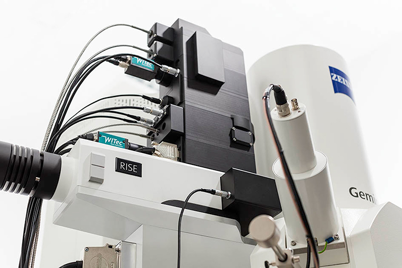 RISE stands for Raman Imaging and Scanning Electron microscopy. The research-grade optical microscope capability integral to every WITec microscope also helps researchers survey their sample and quickly locate areas of interest. Both the objective and sample stage required for Raman microscopy are placed within the SEM’s vacuum chamber and can therefore remain under vacuum for all measurements; the sample is simply transferred between the Raman and SEM measuring positions using the stage of the Zeiss Sigma 300. The configuration allows the Raman microscope to be attached through a standard port of the SEM. The correlation of data and control of Raman measurements are carried out through WITec’s Suite Five software.