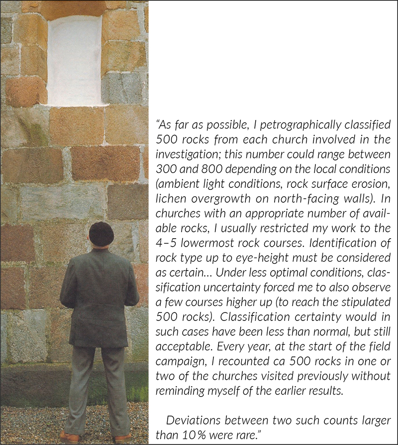 And now the story gets historical. The field sampling part (gathering the local surface rocks from the landscapes in Jutland) was undertaken by the original medieval church builders, who, with absolute certainty, were inspired and driven by very different motivations than science—masonry has it origin in the religious wish to build churches in which to worship. It was Arne Noe-Nygaard’s inspired geological brilliance to make explicit this hidden sampling aspect of medieval church building.1,2 Sampling by religious proxy! Thus, each medieval church takes on the role as a (rather large) sample of local landscape boulders, the size of which amounts to the cumulative wall area of the lowermost 5‒7(8) rock courses. In passing (a treat for TOS experts), one observes that samples of this type are comprised by very, very large “particles”, making it imperative to be able to obtain a large enough square footage—the stated minimum of ca 500 rocks (see magazine front cover for a deliberate pointed focus).